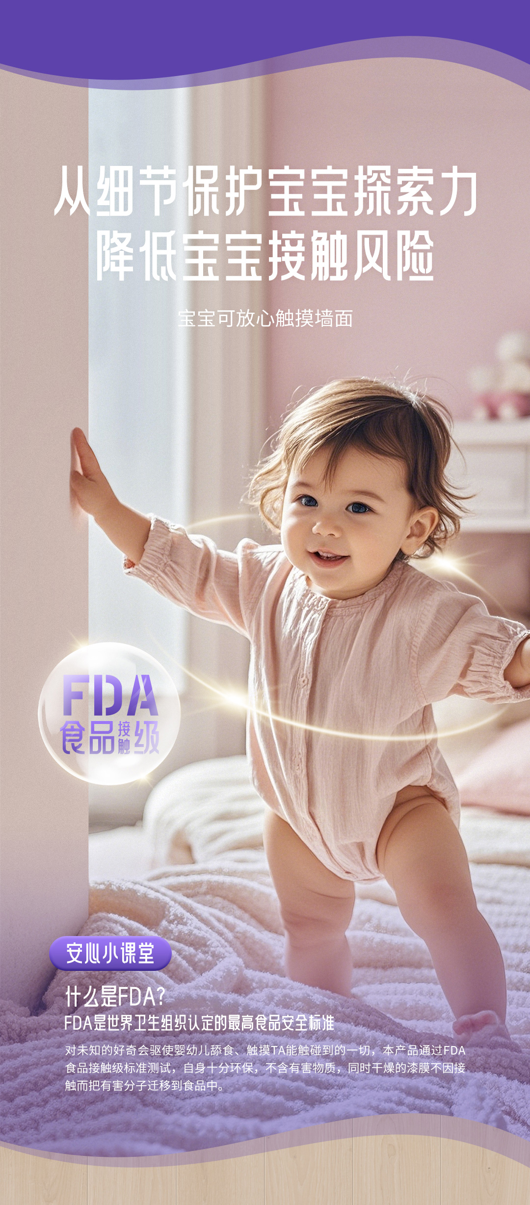 710公海线路检测食品接触级母婴漆是一款专为母婴研发设计的全能型环保墙面漆甄选绿色环保原料、抗醛优质乳液具有高科技净化空气技术气味更清新更环保。产品符合美国FDA食品接触级标准让孩子净享海洋般的自然、清新与健康在抗污方面采用天然生物贝壳粉使产品漆膜细腻达到I级抗污水彩笔可随意涂鸦随时随地还宝宝一个干净、洁白的墙面产品更是可以刷出多种质感纹理效果同时具有护敏抗病毒、超强耐擦洗功能银离子抗菌高达99.99有效抵御墙面各种常见细菌。真爱的呵护总是细致入微让每一位家人都能净享清新的家居环境。